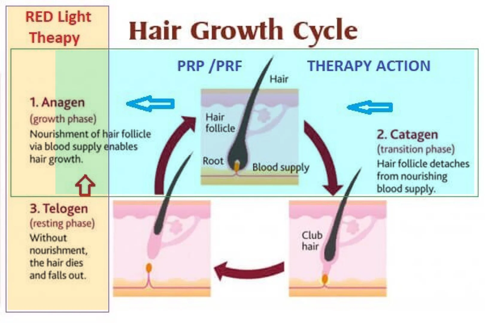 - Anagen (growth phase) - stimulated by PRP and PRF therapy, strengthening active hair follicles.